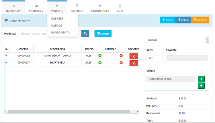 El sistema esta divido en Módulos: Compras donde encontraremos los proveedores, ventas, productos, en el modulo de Ventas se encuentra clientes, cobros, Punto de Venta ademas se cuenta con el módulos de Informes muy importante para ver los detalles en reportes del movimiento de su negocio en la toma de decisiones.